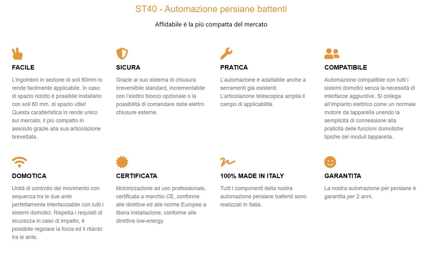 L’automazione ST40 è totalmente realizzata in Italia, i componenti meccanici sono ricavati da acciaio pieno